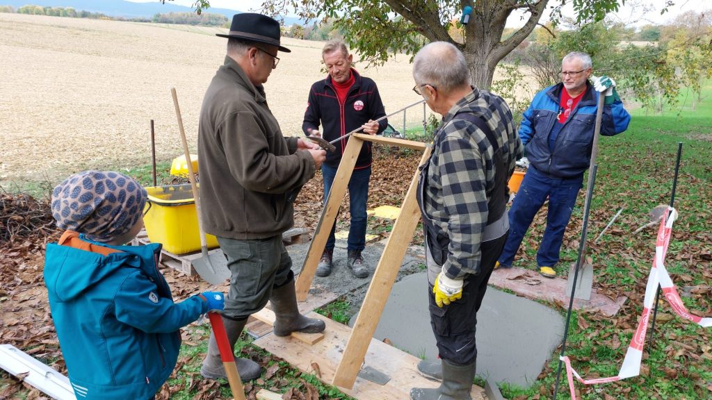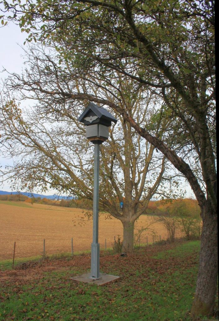 Letzte Woche war es soweit.. Hatten wir doch schon im Oktober das Fundament für die Fledermausstele fertiggestellt, so konnte letzten Mittwoch Christian Dietz, ausgewiesener Fledermausexperte seine selbst entwickelte Fledermausstele montieren.