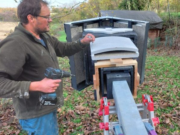 Neben einigen Fertigelementen, die aussen befestigt sind, wird der Korpus aus sägerauhen Brettern und verwitterten (bis der Zementschleier rausgewaschen ist) Heraklithplatten gebaut. Auch Holzbeton kommt zum Einsatz, ein witterungsbeständiges Material, das insbesondere für das Mikroklima der Nischen ein geeigneter Baustoff ist. Dessen Herstellung stellt eine Herausforderung beim Bau dar; muß doch der Feuchtegehalt der verwendeten Holschnitzel genau passen, damit der Holzbeton nicht zu trocken ist und bricht, oder zu feucht ist und die Holzschnitzel zusammenklumpen, so Christian. Die Stele bietet neben optimalen Temperaturbedingungen und Prädatorensicherheit durch verschiedene Maßnahmen ein sehr dauerhaftes Quartier an.