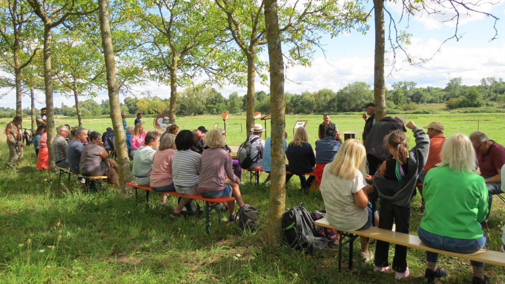 Die Bürgerwanderung 2025 der Gemeinde Dierbach führte 50 interessierte Dierbacher ins Billigheimer Bruch und damit zu einem großen Naturschutzprojekt des Naturschutzverbands Südpfalz und seines hiesigen NVS-Ortsvereins. Die große Wandergruppe hatte nach ihrem Weg durch Acker- und Weinbergsfluren nun die breite Bachaue des Erlenbachs an der Stelle erreicht, wo am östlichen Rand des Mühlhofener Walds auch der Horbach mitsamt Steinfelsbach hinzustößt. Die offene Wiesenlandschaft mit den Weideflächen und Suhlen der Wasserbüffel, den Schilfbereichen, Gräben und nassen Senken ließ sofort den Eindruck eines wertvollen Lebensraums für Feuchtgebietsarten entstehen. Die Bedeutung für die Natur der Region hoben Dieter Zeiß und Kurt von Nida überzeugend hervor, beide vom Vorstand der NVS NaturStiftung Südpfalz, die hier 54 Hektar vom Flächeneigentum der Gemeinde Billigheim-Ingenheim gepachtet hat. Nachdem von Nida das Mosaik und die Attraktion der verschiedenen Lebensräume für Wasservögel, Watvögel, Bodenbrüter, Schilfbrüter, Amphibien und eine reiche Insektenwelt vorgestellt hatte, führte Zeiß die Entwicklung vom Niedermoor mit der späteren Nutzung der Torfvorkommen und der Sumpfwiesen bis zu deren Urbarmachung im Dritten Reich und nun wieder zu der aktuellen Biotopaufwertung vor Augen. Die Referenten konnten angesichts der Problematik der Klimaveränderung auch den Wert des Gebiets für den Hochwasserschutz und die Grundwasserneubildung betonen. Die öffentliche Hand, sprich die Kommune, habe mit der langfristigen Kooperation mit dem NVS nicht nur die Artenvielfalt als entscheidende Zukunftsaufgabe gefördert. Auch die Lösung der zweiten Problemstellung wäre hier angegangen worden. Die Dierbacher Gäste würdigten die Leistungen des NVS als fachkundige Gestalter und fleißige Betreuer mit vielen Arbeitseinsätzen im Jahresverlauf. Dies brachte in seinem Dank besonders Ortsbürgermeister Manfred Huckle zum Ausdruck. Auch ihm liegen in der Dierbacher Gemarkung eigene Aufwertungsprojekte am Herzen, die eine uralte Kulturlandschaft für das Überleben ihrer Bewohner braucht.